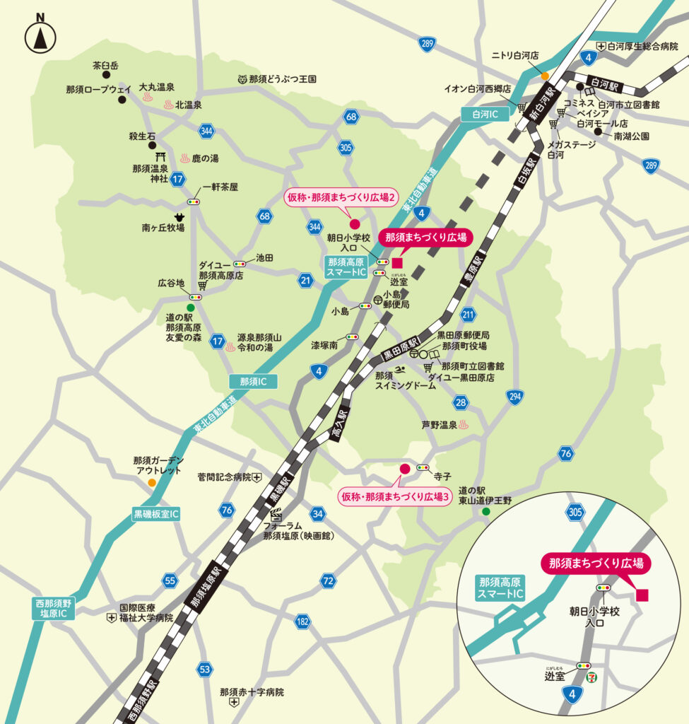 〈那須まちづくり広場〉から、周辺施設へのアクセス