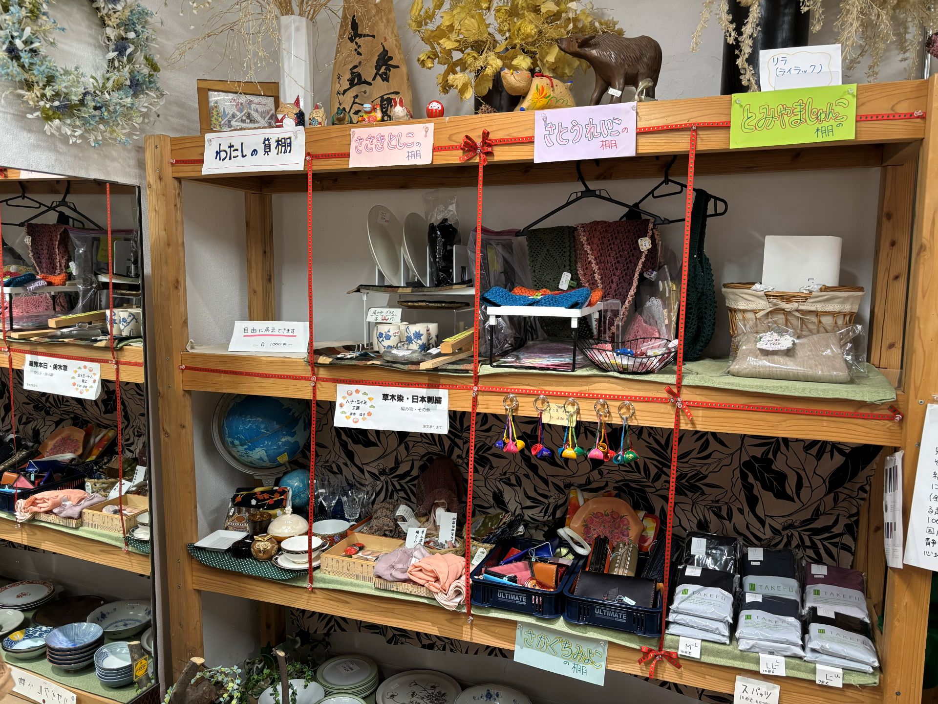 竹布と地球にやさしい雑貨の店。竹布は肌に優しく抗菌性があり、静電気がほとんど起きません。アウターから下着まで揃えてます。また”洗濯マグちゃん”、農福連携で製造している”いぶりがっこ”、B型就労事業所の製作品やリサイクル品も並んでいます。